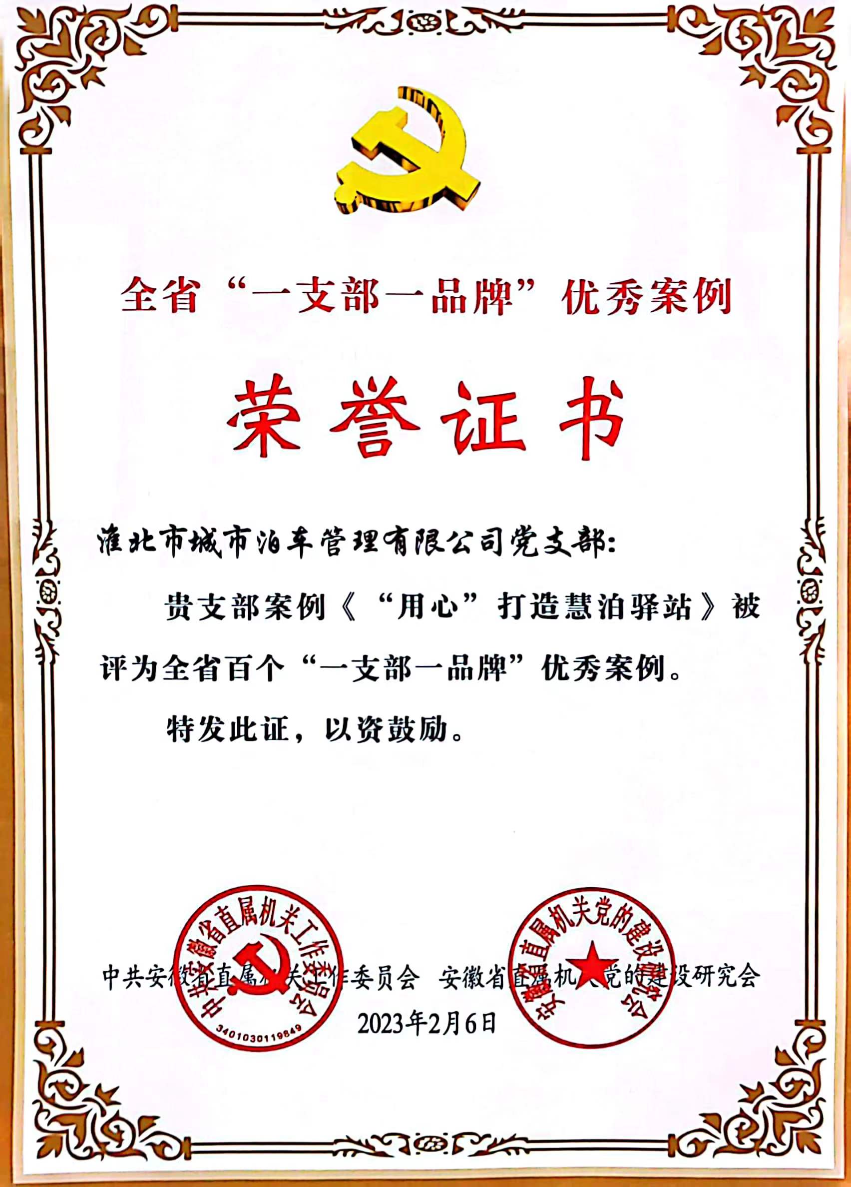 日前,中共安徽省直屬機關工作委員會、安徽省直屬機關黨的建設研究會聯(lián)合發(fā)文表彰了全省百個“一支部一品牌”黨建工作典型案例,此次“一支部一品牌”黨建工作典型案例評選全省共有400家單位586個優(yōu)秀案例參加初評和復審,最終綜合評定100個“一支部一品牌”優(yōu)秀案例?;幢背鞘胁窜嚬芾碛邢薰?/span>黨支部獲得通報表彰,支部的黨建品牌《“用心”打造慧泊驛站》獲評全省百個“一支部一品牌”優(yōu)秀案例。