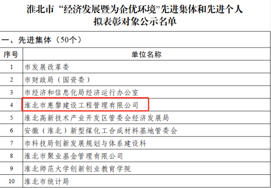 淮北市惠黎建設(shè)工程管理有限公司榮獲淮北市“經(jīng)濟(jì)發(fā)展暨為企優(yōu)環(huán)境”先進(jìn)集體稱號(hào)