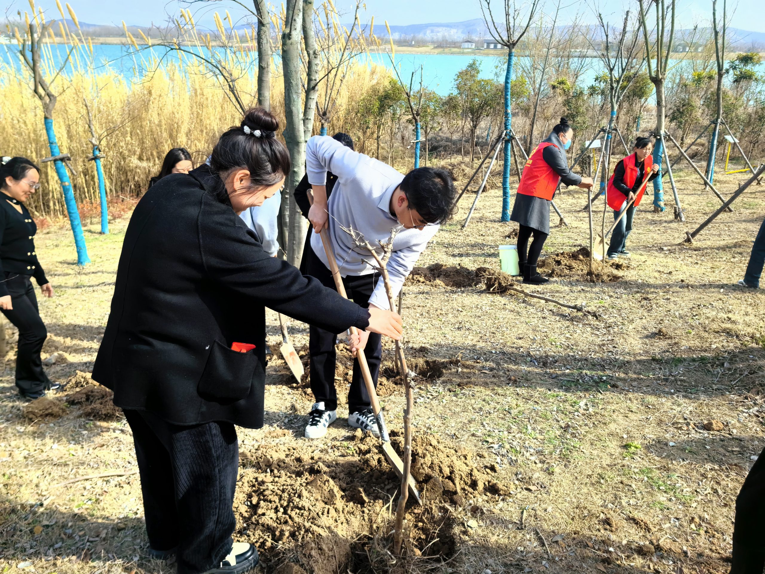 迎著微風(fēng),大家?guī)瞎ぞ撸瑹崆楦邼q、干勁十足,積極投入到植樹(shù)活動(dòng)中。揮鍬鏟土、栽苗培土、踩實(shí)土壤,大家協(xié)作配合,現(xiàn)場(chǎng)一派火熱繁忙景象?;顒?dòng)中共栽植30余棵樸樹(shù),栽種樹(shù)苗整體錯(cuò)落有致,生機(jī)盎然,為綠金湖增添了一道靚麗的風(fēng)景線。