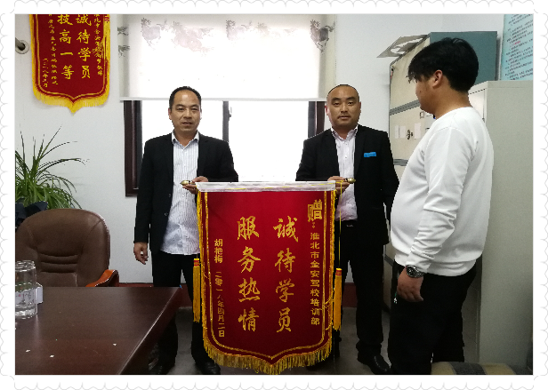 2018年4月2日,淮北市金安駕校學員胡艷梅來到金安駕校培訓(xùn)部,將一面繡有“服務(wù)熱情、誠待學員”字樣的錦旗送到培訓(xùn)部的工作人員手里,對培訓(xùn)部的所有工作人員表示感謝。