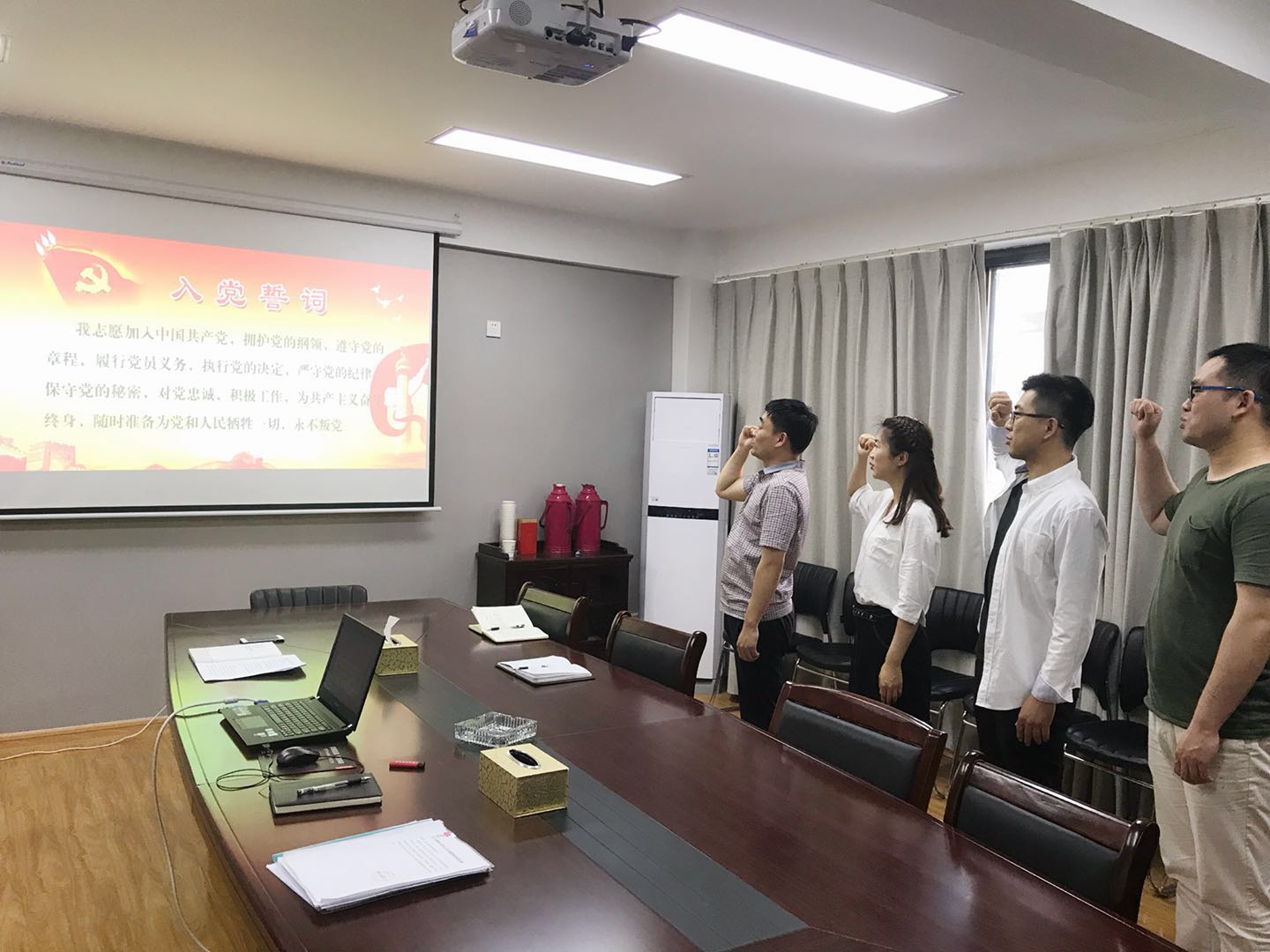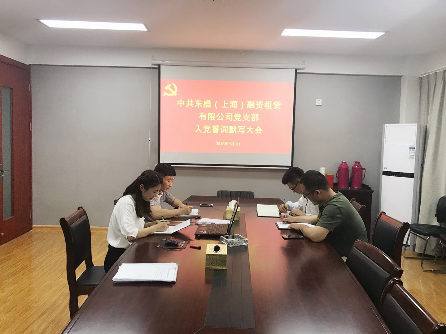 2018年5月3日下午,東盛公司全體黨員在會(huì)議室開展“重溫入黨誓詞”活動(dòng),在總經(jīng)理王智的帶領(lǐng)下,面對(duì)黨旗,大家舉起右手,精神飽滿、莊嚴(yán)宣誓,集體重溫入黨誓詞。并在宣誓后,進(jìn)行了入黨誓詞的默寫。