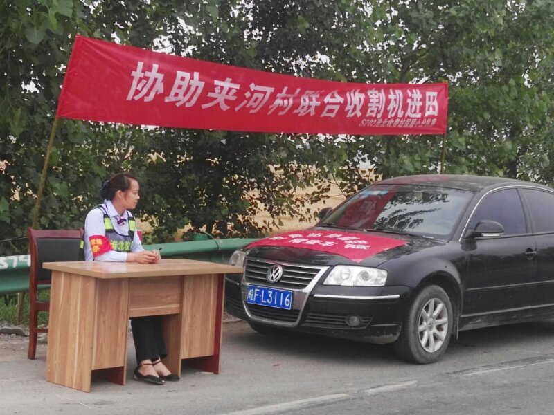 S202收費站設立協(xié)助聯(lián)合收割機進田服務點,有效挽回公司損失