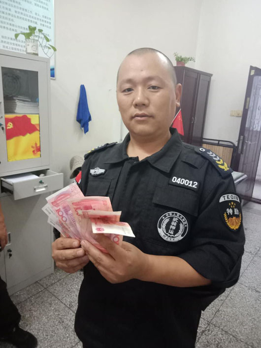 2018年9月28日17:10分,淮北市保安有限公司派駐淮北徽商銀行押運四中隊78號車組在濉溪徽商銀行虎山路支行執(zhí)行接款任務警戒時,車組長劉云寺在網點門口撿到現金700元。任務結束后立刻上交到中隊,中隊管理人員及時聯系徽商銀行保衛(wèi)科,通過調取銀行監(jiān)控錄像尋找失主。29日上午10:35分,中隊管理人員將700元現金交到失主手中,當事人非常高興并由衷地表示感謝!