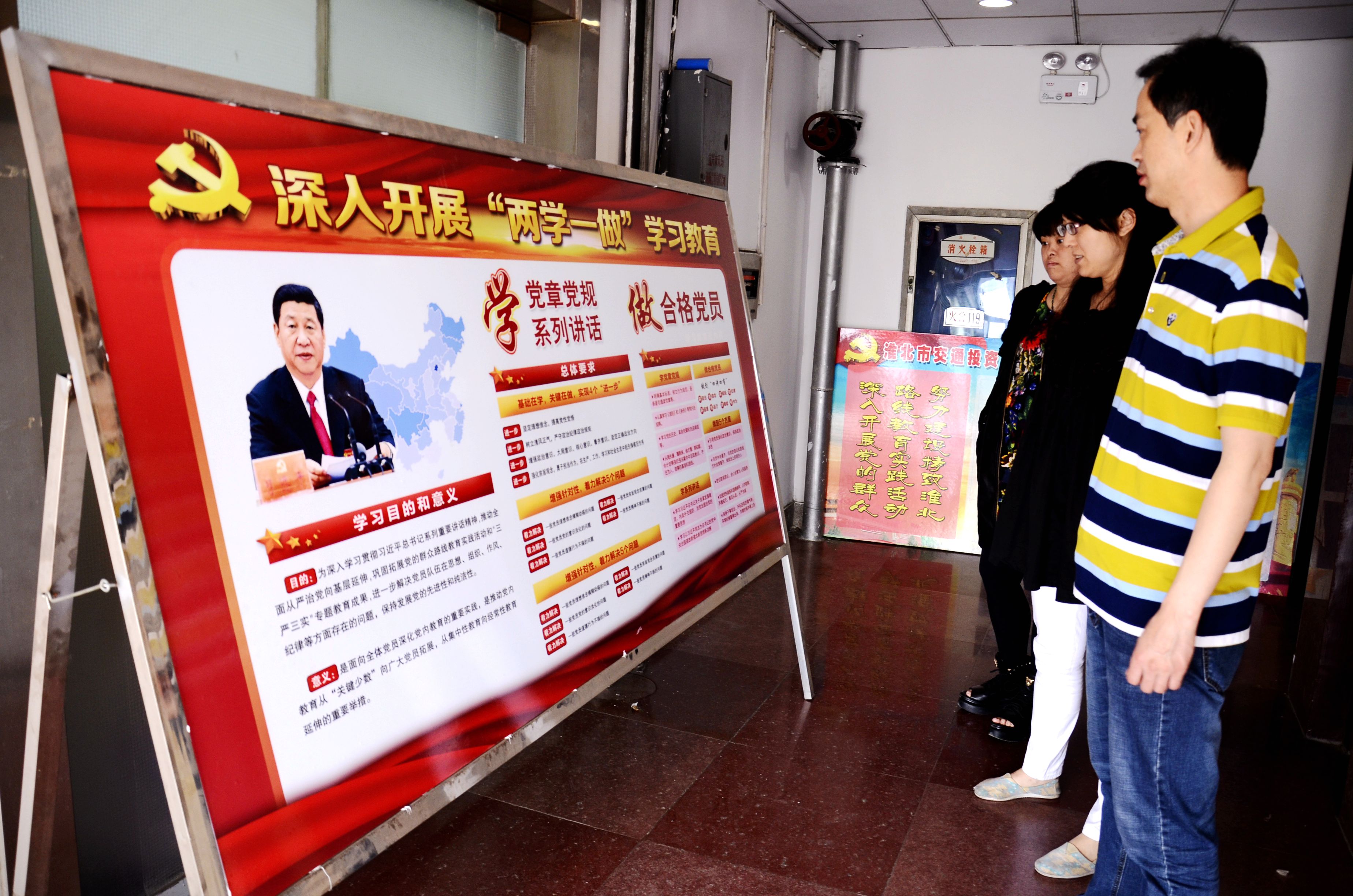 圖為同創(chuàng)集團、交投公司、保安公司的 員工在觀看 兩學一做學習教育展板。