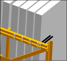 c. 墻板運輸前,每塊構(gòu)件必需用鐵桿插銷固定,外面兩側(cè)(上、下部位)用2根鐵桿插銷固定,中間每塊構(gòu)件上、下部位,均用一根插銷固定,如下圖示: